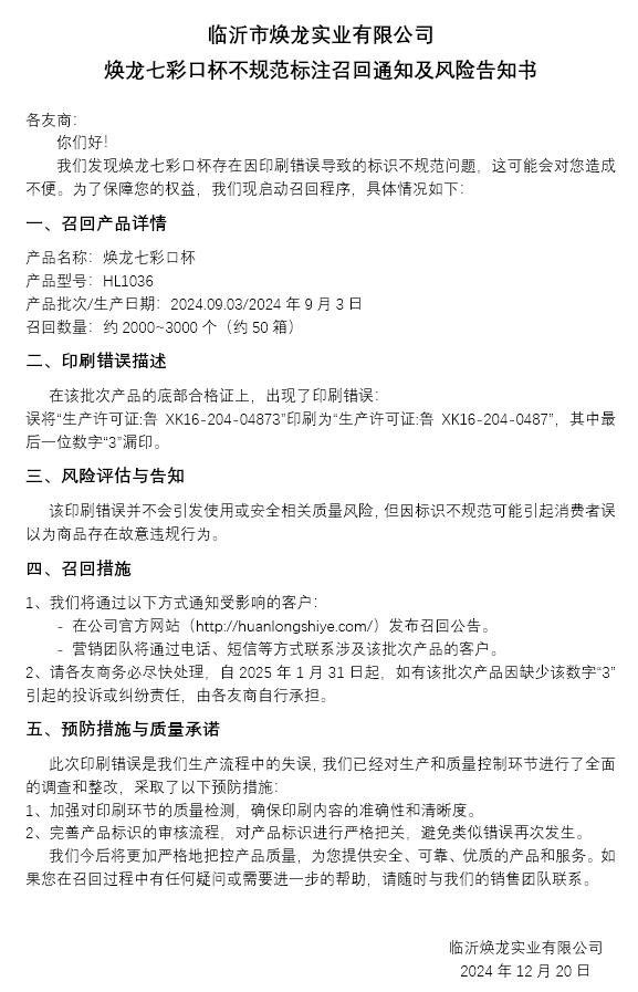 煥龍七彩口杯不規范標注召回通知及風險告知書